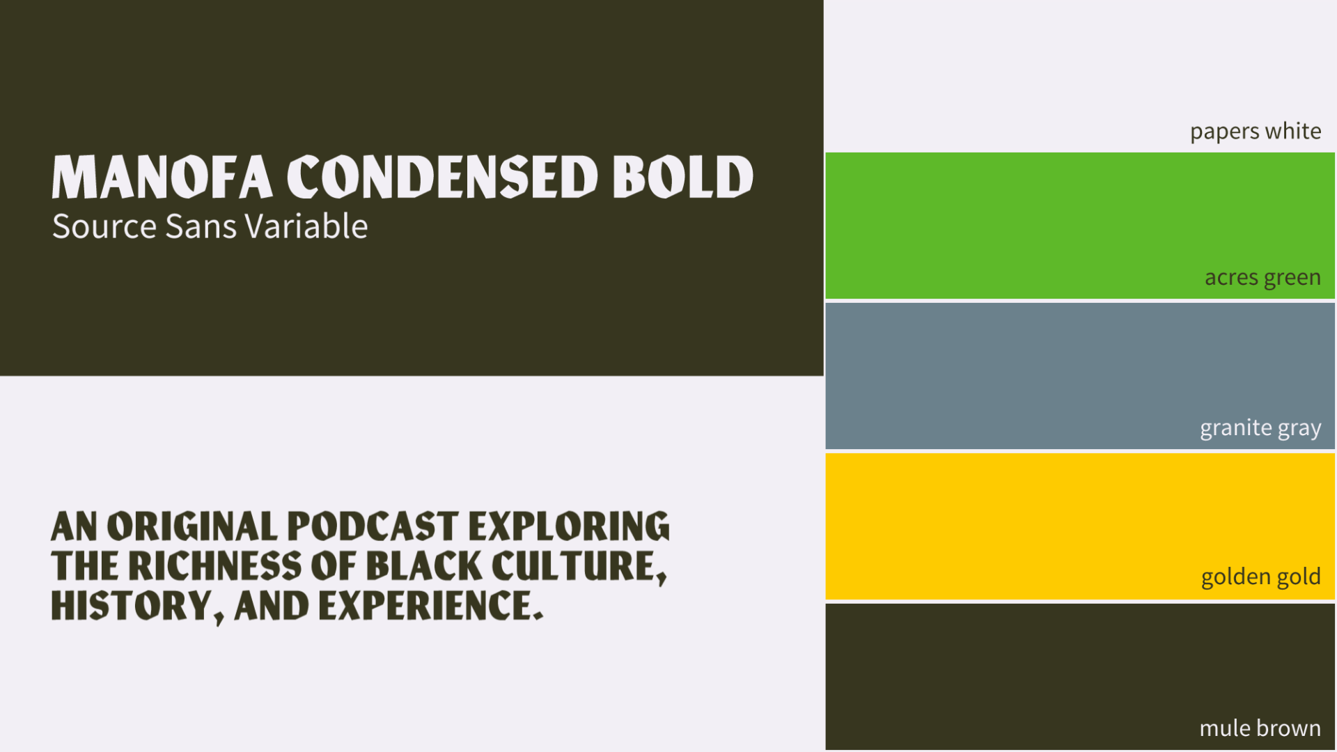 Proposed branding for a podcast centered around the Black American experience. I proposed a very literal interpretation of the name of the podcast. The logo encorporates the imagery of fields and stamps, while still maintaining a more contemporary look to match the tone of the podcast.