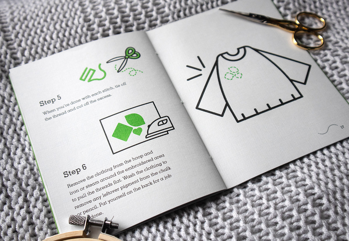 The interior of each book is printed on Neenah CLASSIC Linen Antique Gray using Risograph printing, which is playful and less harmful to the environment than normal printing. Misalignment is inevitable, but here it enhances one of Re-Sew's core values: an imperfect object is can be just as useful as a “perfect” object. All three books are bundled by a bellyband using a needle for the hyphen in “Re-Sew”