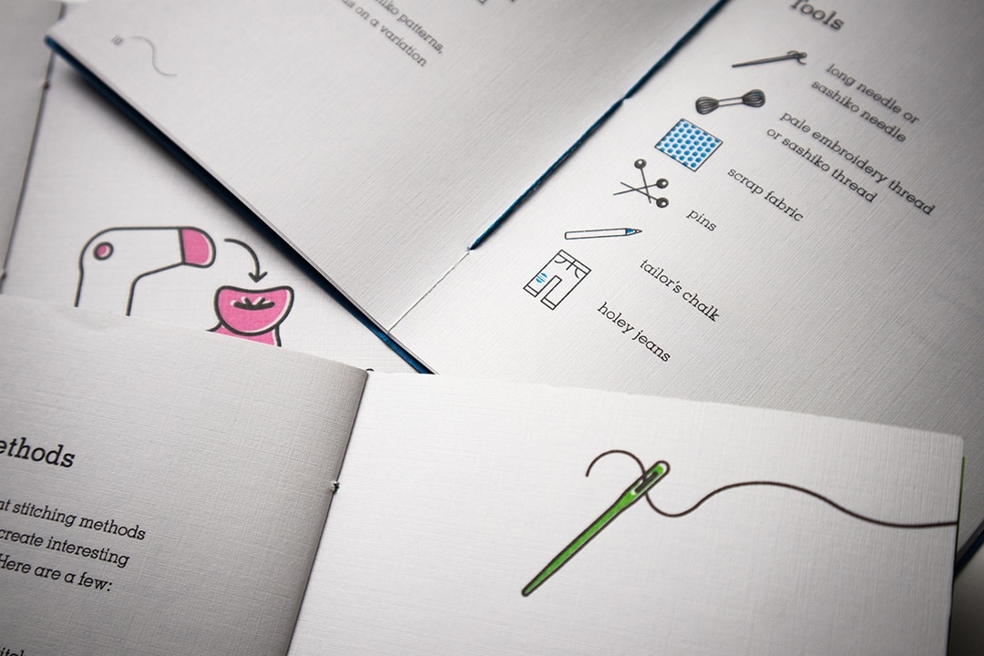Re-Sew is a small-run publication that focuses on cloth mending and the importance of sustainability in regards to fashion. The goal of Re-Sew is to advocate for “old” items and diminish the idea of “disposable” clothing. Each booklet focuses on a common mending method.